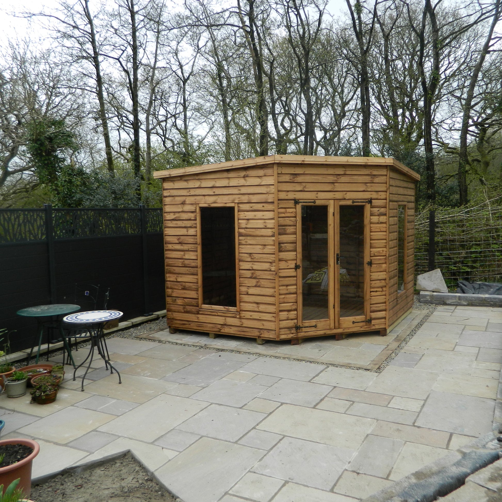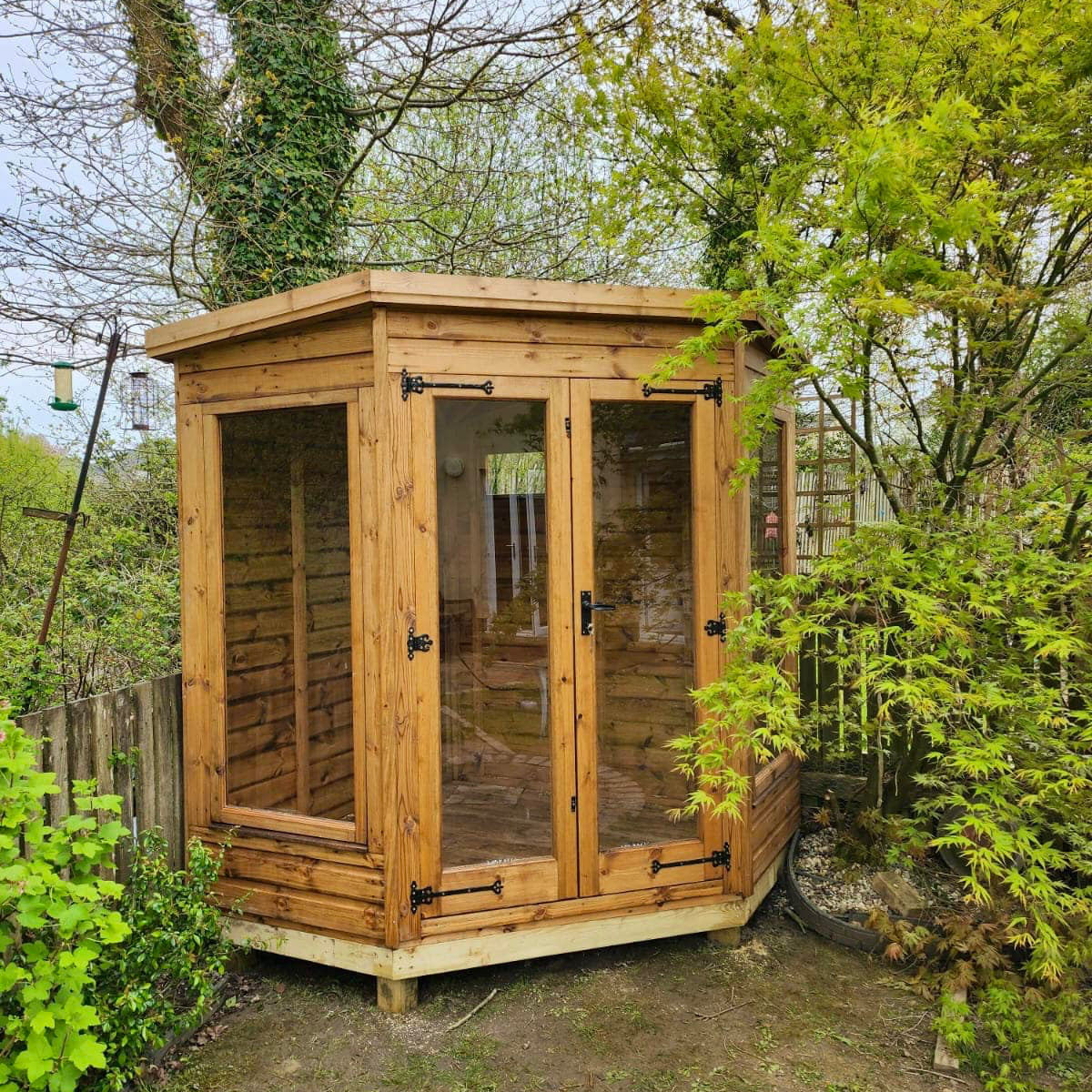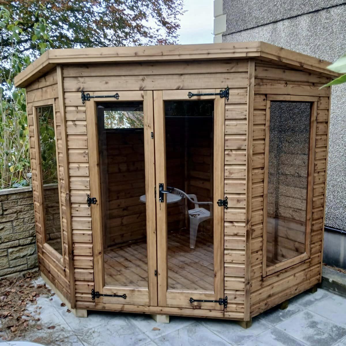 Enjoy the luxury of your own private corner in your garden with this sophisticated corner summerhouse. This space-saving garden building will provide a cosy, protected area for you to relax and take in the beauty of nature. It is a perfect choice for those who want to make the most of wasted corner space.