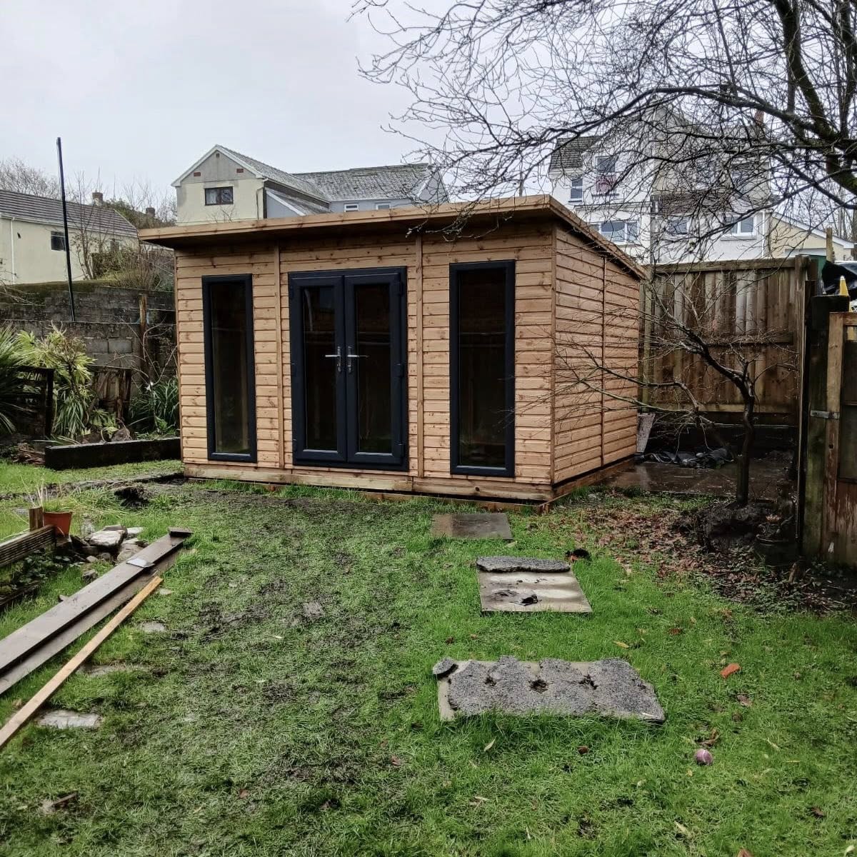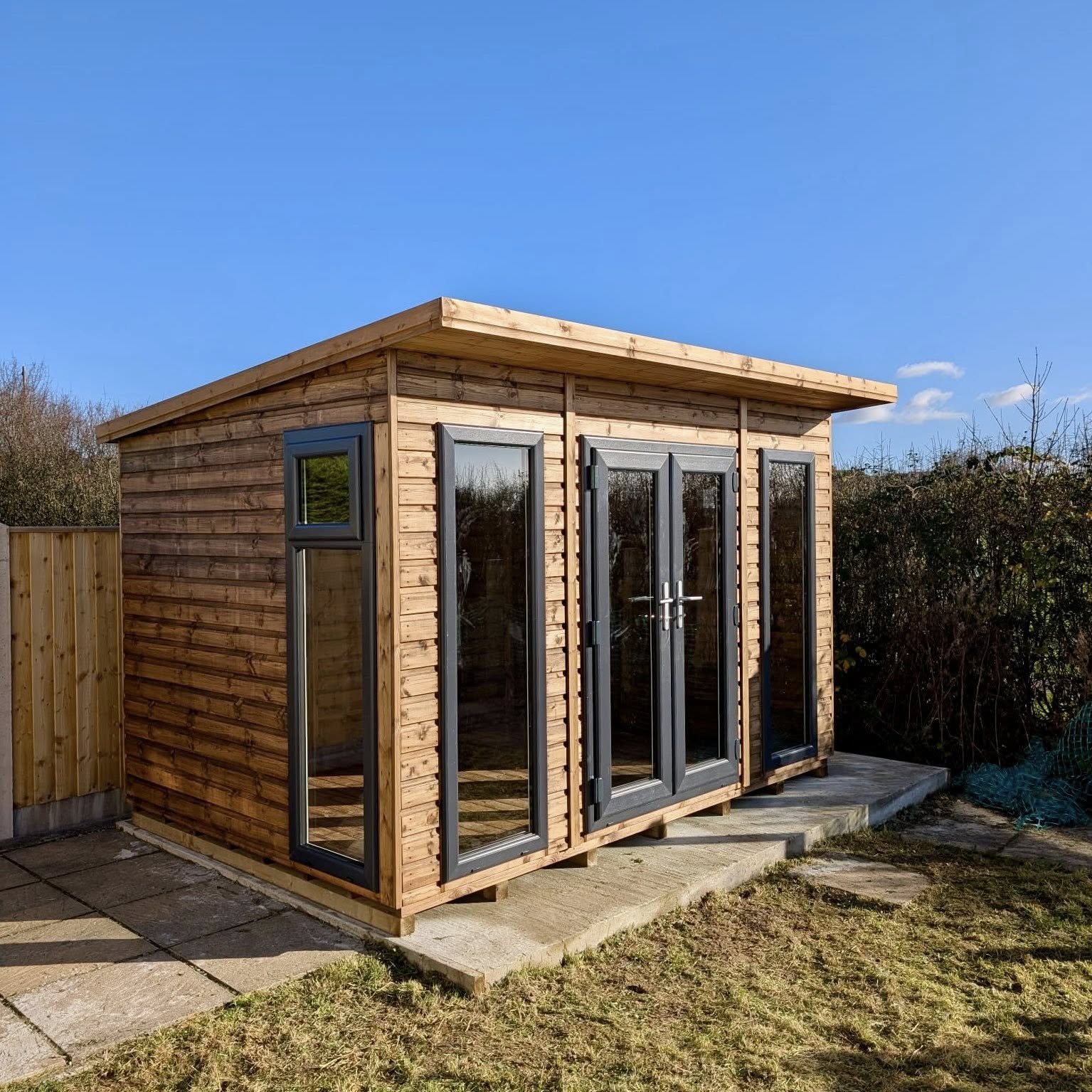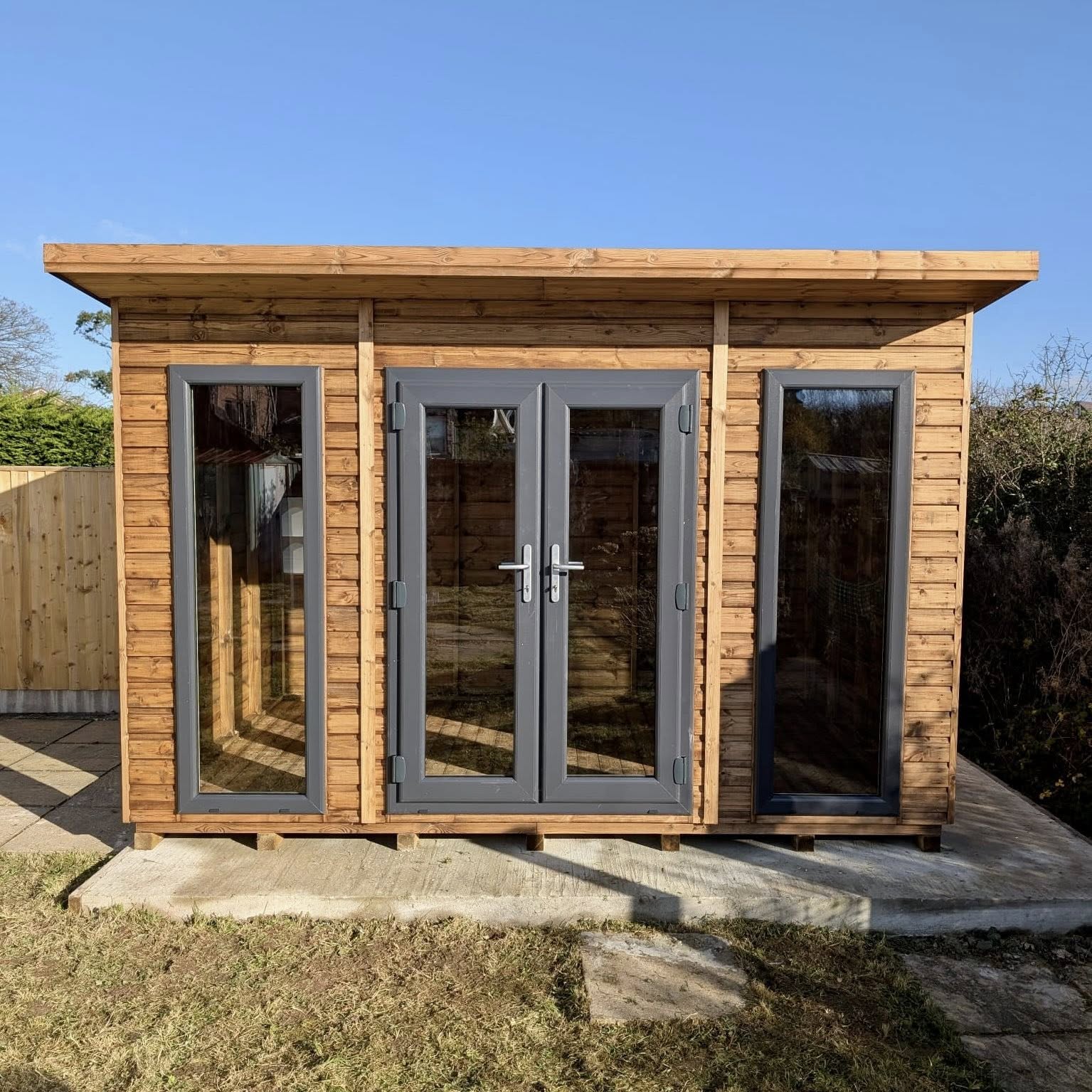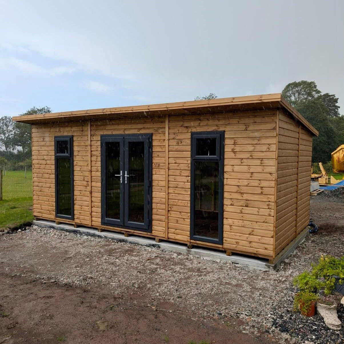 Built with heavy-duty 3” x 1½” planed framing, and finished with 20mm deluxe timber cladding, the Sorrento is designed for strength, stability and long-term durability. It features a generous 15” roof canopy with plain fascia boards, giving a clean, contemporary look while offering added shelter at the front.